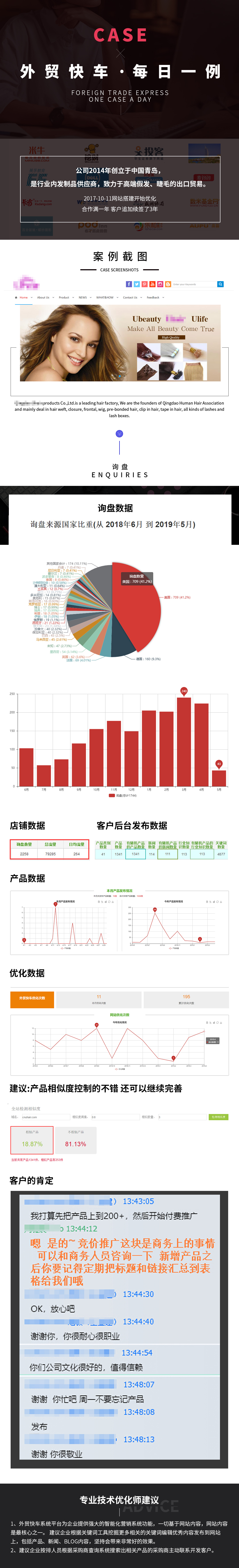 客户于2017年选择外贸快车产品,初次签订了1年合作协议,2018年到期以后选择了一次性续费3年。目前外贸快车网站上共发布了1341个产品,并且客户很注重产品文案的质量,不相似产品的比例高达80%以上。产品新闻和行业知识也持续在更新中,目前网站上已发布111条新闻和113条行业知识。这些页面共计为客户带来2258条询盘,日均流量更是高达264个。