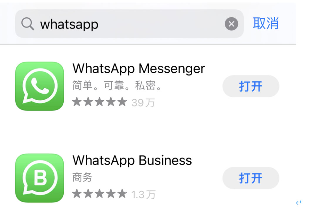 以苹果手机举例,我们在Appstore搜索WhatsApp会出现以下2个:
