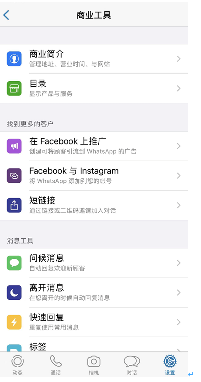 更为重要的一点,WhatsApp Business和WhatsApp Messenger最大的不同就是这一块——商业工具。